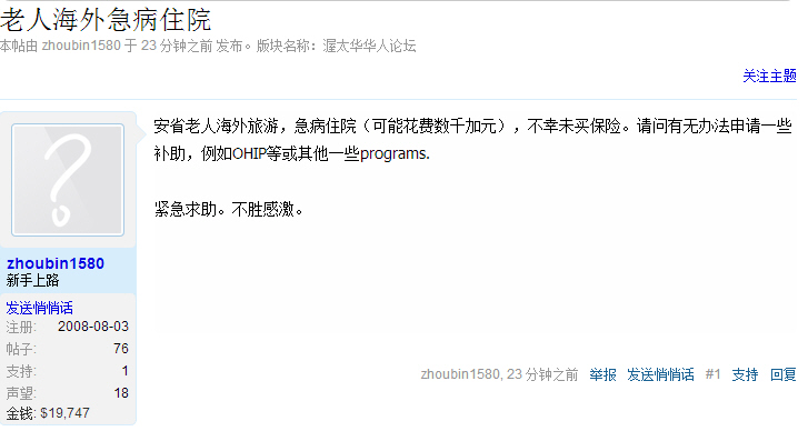 数千元不算啥,尤其是给自己的父母。先把心思花在救助上吧。Good luck!安省老人海外旅游,急病住院(可能花费数千加元),不幸未买保险。请问有无办法申请一些补助,例如OHIP等或其他一些programs.