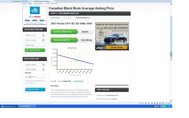 你说的品均价格的平均公里数是多少??不然毫无意义,我相信我的公里数是最低的,同等公里数的还有将近15000的,你可以查询下面价格和公里数的关系看看我的价格还是偏低的http://www.canadianblackbook.com/black-book-values/index/display/neworused/used/year/2005/make/Honda/postalcode/K2B6R1/model/CR-V/mode/marketanalysis/trim/LX/style/4D Utility 4WD/