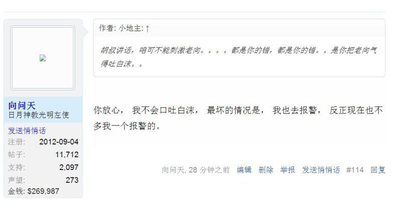 TIFF 晴空一鹤排云上~~遥引诗情到碧霄 VIP 注册 2011-09-16 消息 30,398 荣誉分数 5,901 声望点数 273 2014-05-08 #55 向问天 说: 因为我发了这个, 一伙人联合要求炸楼。 瞧他们那点出息 浏览附件417136 点击展开... 炸了楼,你的截屏才值钱,成绝版啦。赶快摆摊卖吧,估计不少人买呢。看你被围殴,很有喜感的。