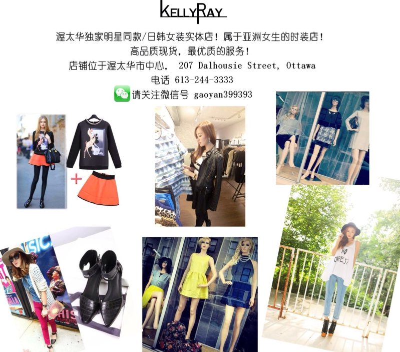 渥太华首家也是独家明星同款日韩女装实体店,位于市中心 207Dalhousie St. 真正属于亚洲女生的时装店!店内款式紧跟流行趋势,同时可以提供代购服务。感兴趣的小伙伴请加店主kelly的微信:gaoyan399393.