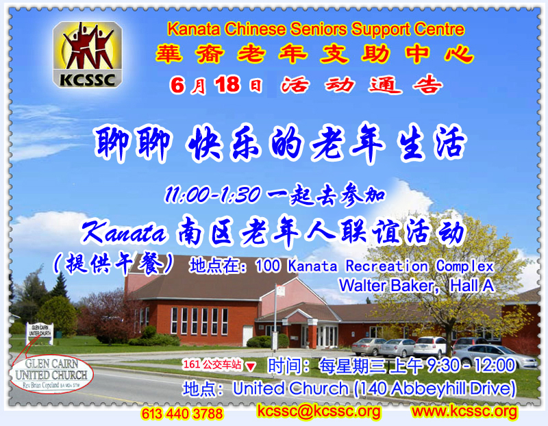 KCSSC 新手上路 注册 2011-07-13 消息 452 荣誉分数 9 声望点数 28 2014-06-17 #1 6/18 周三活动内容 六月是老年月,本周三在KRC(Kanata活动中心,2楼大厅)有一个老年交谊会。 现场将有现场演唱及简单午餐。欢迎参加! 公车#118,161可到,国庆日放烟火的地方。 附件 20140618 UC社区老年活动通知.jpg 607.4 KB · 查看: 54