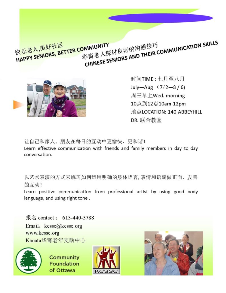 快乐老人,美好社区 Happy Seniors, Better Community 华裔老人探讨良好的沟通技巧 Chinese seniors and their communication Skill 时间:七月 - 八月 (7/2 - 8/6), 周三早上 10am- 12pm 地点: 140 Abbeyhill Drive 公车 #161