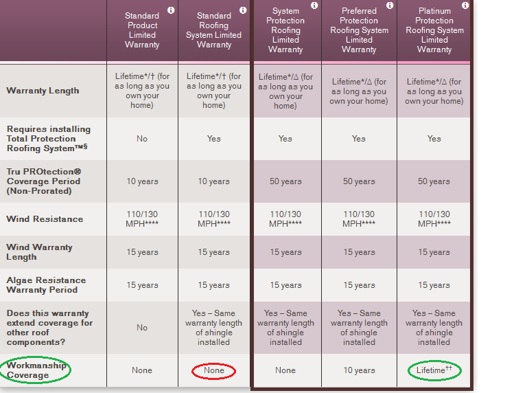 他山之石 说: 我说的是房顶的保修, 你说有Life-time保修? 我没听说过。 是房子的Life-time, 还是人的Life-time? 点击展开... 对,两者是不同的。俺说的是对于厂家认证安装公司,可以担保Life-time(Material+Labor,是厂家给的Warranty) 比如:http://www.owenscorning.com/roofing/warranty-101/#WarrantiesTable