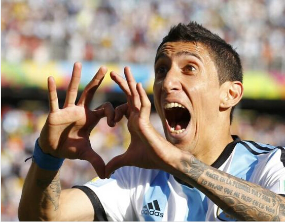 快乐的迪玛利亚欢呼着,用双手做出一个爱的心型。这爱的手势让我再一次看到了南美人对足球的热爱,和队友间理解、默契和感激的足球人本色。
