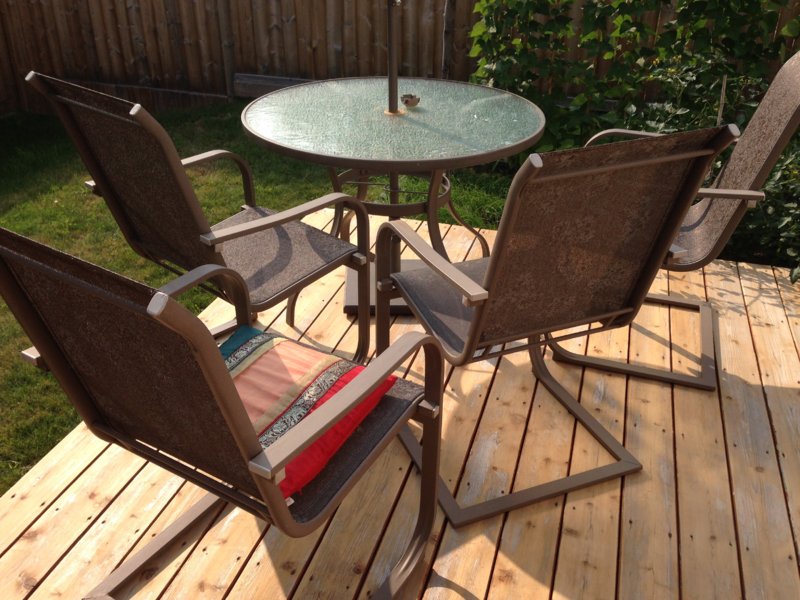 阳台或者后院用桌子椅子!铄钢骨架材料,结识耐用!Heavy duty patio set (one table and four heavy-duty chairs): $110