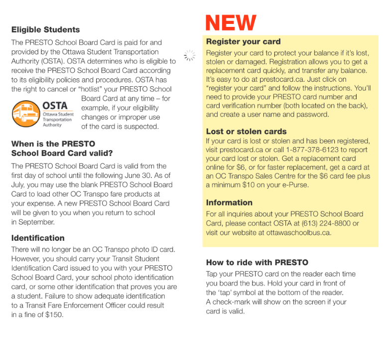 yihuo 说: 转让 high school student september Presto card 月票 $60 点击展开... 这个Presto card月票,是一学年的,Ottawa Student Transportation Authority (OSTA)每个月往里面充值,有效期至明年六月三十日。 http://www.ottawaschoolbus.ca/images/presto/NEW Register your PRESTO card now August 2014 Poster_E.pdf