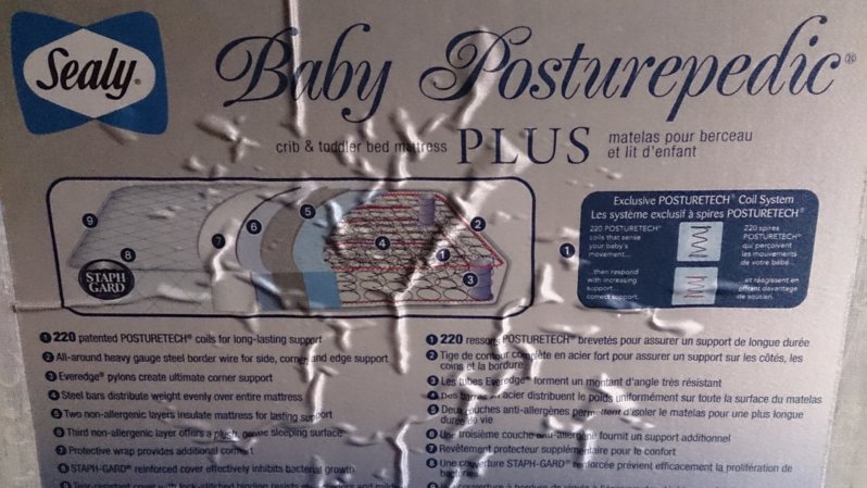 出售嬰儿床垫 Bought new from ToysRus. Like new, used only for 1 baby. Original price $120+tax. Asking $60. Sealy Posturepedic Plus model.