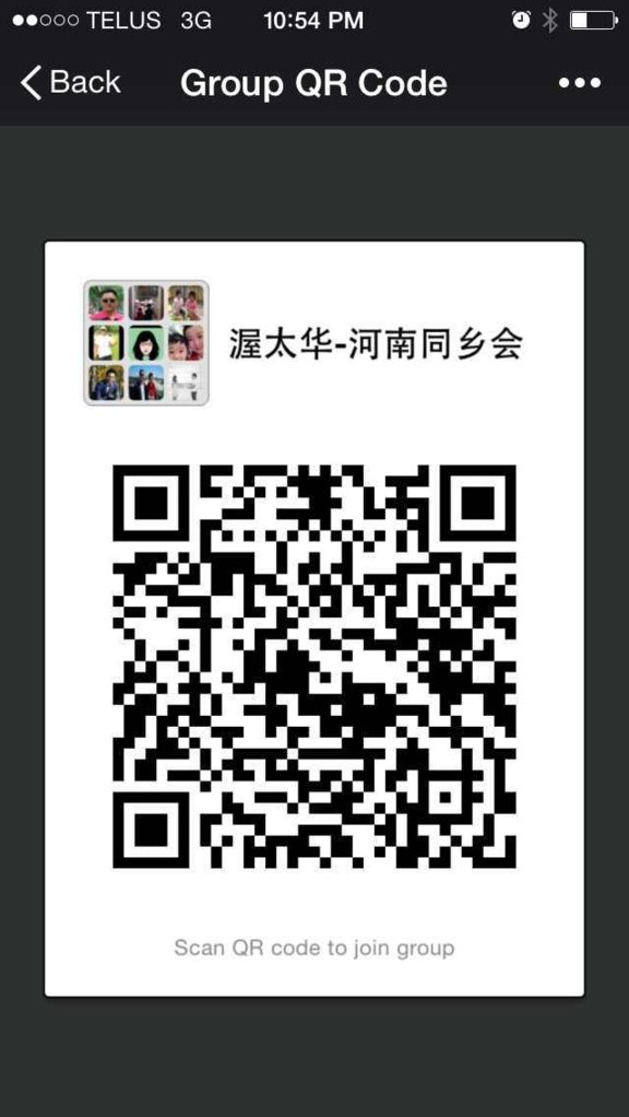 除了搜索河南同乡会的微信号外,还可以扫描我们的群的 Group QR Code.