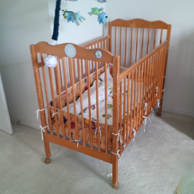 可拆卸婴儿木床带床垫(二手的)和床头旋转音乐玩具($30买的),送床帏和两套IKEA买的床垫套:50
