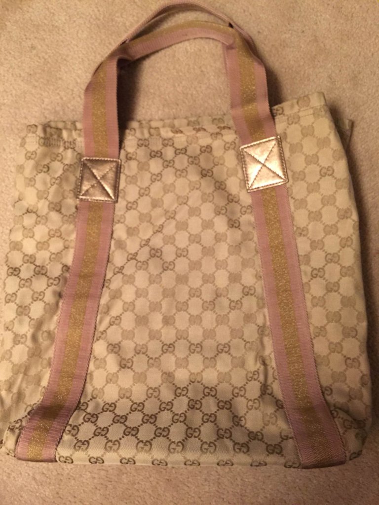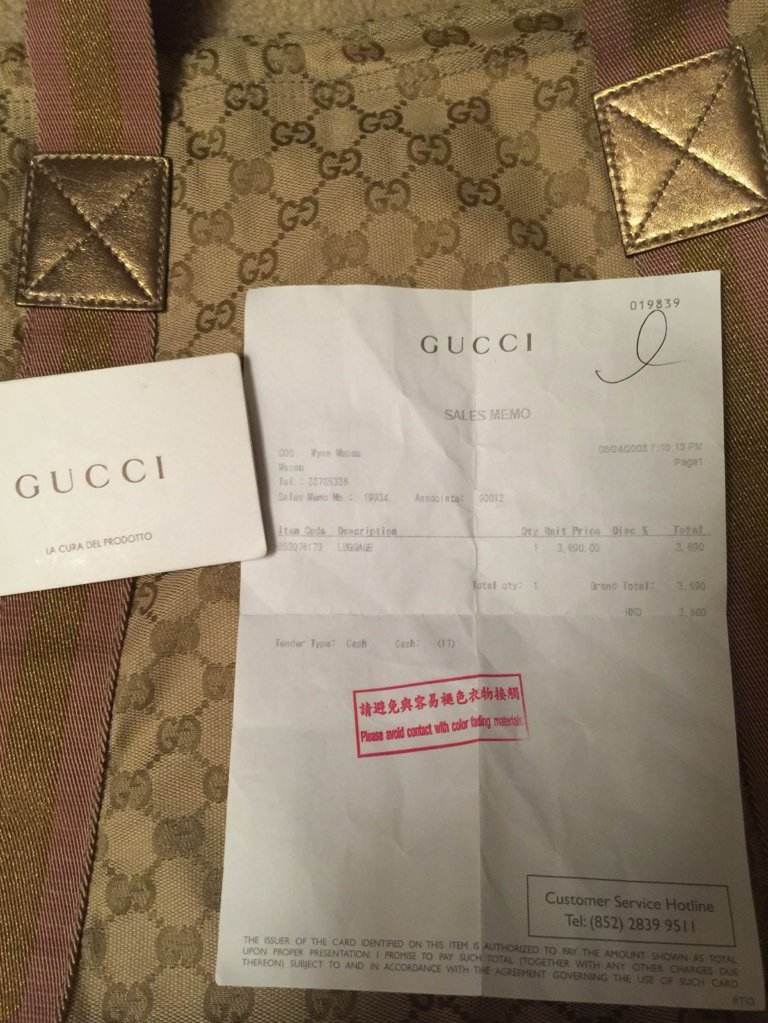 6.Gucci monogram shopping tote。金色,颜色比较少见。8新,四角有轻微磨损。澳门威尼斯人买的,有小票,身份卡,防尘袋,保真。$290。
