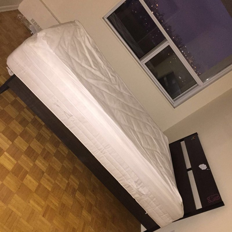 出售一个月新的购于IKEA的Queen size床垫和床架 床垫是很厚的记忆床垫 当时买的床垫床架加起来差不多600加币 用的是女生 所以非常新 现价一起280加币拿走 需自取。还送床罩 就是罩在床垫上那个
