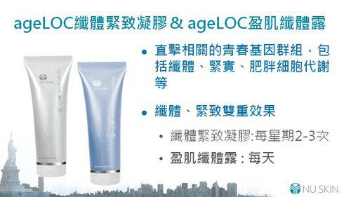 ageLOC美體套組—重現青春體態從今天起,你可以一手掌控自己的窈窕曲線。透過ageLOC科技可以讓你的身心重返年輕。快來體驗全球最先進的基因抗老美體護理方案。運用ageLOC科技,ageLOC美體套組將帶給身體截然不同的纖細、平滑及緊實感,在家即可輕鬆享受頂級基因美體護理。同時使用ageLOC美體套組內三項產品,可發揮產品最佳效果,體驗最緊緻的身體曲線,全面展現青春窈窕。主要功效:· 直擊老化根源· 減少體脂肪與平滑橙皮組織· 雕塑更光滑、勻稱、緊緻的身形· 提高皮膚緊緻度· 提升整體皮膚狀況· 幫助淨化皮膚與讓肌膚充滿能量· 潤澤皮膚ageLOC美體SPA打造身體極致曲線。NU SKIN運用ageLOC美體SPA掌握美體的關鍵要素。 ageLOC美體SPA可10倍提升ageLOC成分直達肌膚*。脈衝電流的設計更可帶給手臂、臀部與大腿肌膚最佳的抗老效果;同時可幫助刺激、淨化和活化肌膚,減少老化現象的發生,帶來纖細、光滑和緊緻的外表。ageLOC緊緻凝膠纖細、緊緻和光滑的肌膚。ageLOC緊緻凝膠搭配ageLOC美體SPA一起使用,將可帶給你不可思議的抗老效果。透過密集的SPA護理,擊潰脂肪、平滑肌膚、熨平橙皮,達到改善整體身體外觀的效果。ageLOC緊緻凝膠同時能讓細胞充滿能量與淨化肌膚,達到抗老效果。 ageLOC緊膚乳更窈窕的曲線、更光滑的肌膚。ageLOC緊膚乳為身體帶來絕佳抗老功效。ageLOC緊膚乳的成分可抑制脂肪生成、促進脂肪分解、預防橙皮組織形成。它同時可加速細胞代謝,幫助細胞新生,讓肌膚容光煥發。 透過NU SKIN掌握你的未來。ageLOC科技結合突破性科學與獨家抗老產品,帶給你無與倫比的絕佳事業商機。掌握ageLOC,就等於掌握活得更年輕、更長壽的機會。ageLOC美體組套組內容包含:2台ageLOC美體SPA(含底座與提袋),6條ageLOC緊緻凝膠、6條ageLOC緊膚乳、2本產品說明書。