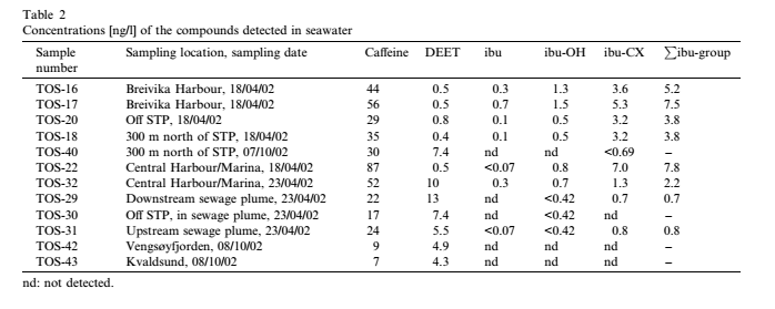 顺手找了篇文章,其中有挪威海水样品里面咖啡因和DEET等的浓度