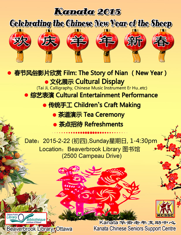 Kanata华裔老年支助中心将于二月二十二日和Beaverbrook图书馆合作举办羊年庆新春活动,华人同欢之余也向Kanata社区里的其他族裔朋友,介绍分享中华文化,活动内容分段进行,多样精彩,具有知性又兼容趣味!大人小孩通通欢迎!!!即日起请至Beaverbrook图书馆柜台取票。凭票免费入场观赏节目!