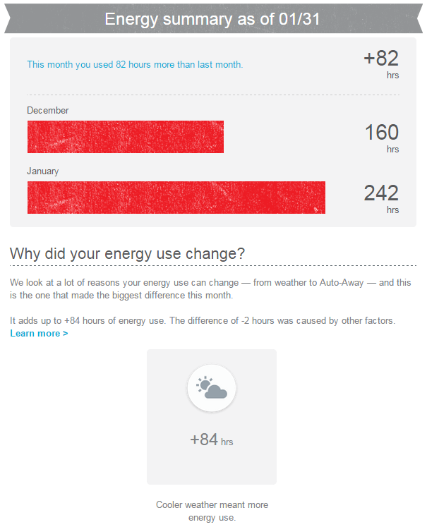 安妹妹 高级会员 注册 2014-11-18 消息 1,583 荣誉分数 411 声望点数 93 2015-02-10 #25 月下独酌 说: 一月份冷啊,没办法。我家也200了 Nest Energy Report 浏览附件489026 点击展开... 那就是说下个月还有可能少点。。。算是点安慰吧。太吓人了。。