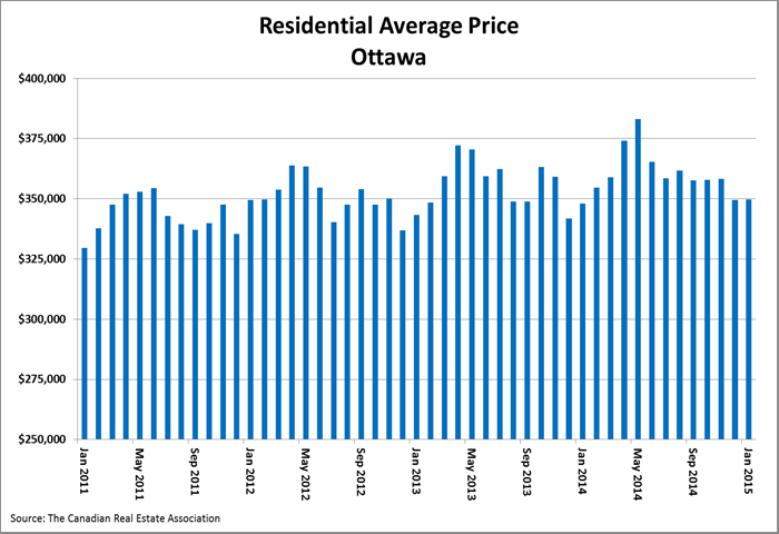 The average sale price of residential properties, including condominiums, sold in January in the Ottawa area was $348,617, an increase of 0.5 per cent over January 2014. The average sale price for a condominium-class property was $250,406, a decrease of 5.8 per cent over January 2014. The average sale price of a residential-class property was $370,442, an increase of 0.5 per cent over January 2014.