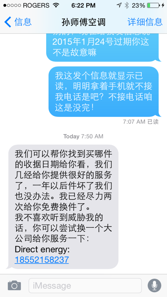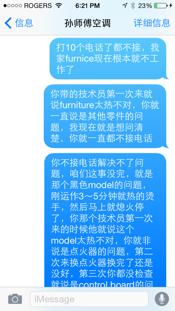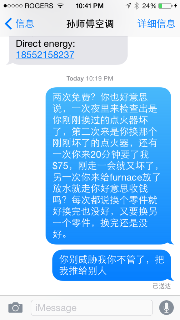 2014年1月的时候家里FURNACE坏了就找了一个华人公司(Best Energy Conservation华人冷暖空调服务公司)来家里修,换了一个黑色的MODEL,580加币,去年12月的时候又坏了就还是联系他们,他们很快就来上门查看,进来后随便看了看就说你这个点火器坏了,要换,换完肯定好,我想太冷了肯定要换不然怕水管冻裂,第二天上午来了换完了给了260加币,当时好了,到了晚上又坏了,马上给他们打电话,来了后清理一下说要换那个传感器60加币,我说好尽快吧,隔天早上给我打电话说你那个CONTROL BOARD要换,换完肯定好300加币,我说能便宜点吗,她说不行我没挣你一分钱,厂家就这价格,当时我家温度12度,实在办法了我又说好,来了换完那个BOARD后说肯定没问题了你这个可以再用9年你可以安心回国了,我就真的以为一切都好了前后一共花了500多零件钱,隔天早上起来家里温度又16度了,我又马上打电话给她并问我以前那个BOARD呢,她说扔了,这次他们来鼓捣这鼓捣那的又收了75加币服务费,之后就一直没好每次都说你家FURNACE太奇怪了,是不是受诅咒了,还跟说以前她修过一家也没修好说是说风水有问题,还有一次他们来查了半天说是刚换的点火器坏了要再换一个,后来又来过几次呆了十几分钟就走了倒是没收钱(说真的我都忘了他们到底来过多少次了),可还是没修好我给他们打电话说我想把钱退回来,我2014年年初和年底一共花了1000多加币,可问题根本没解决,那女的就说我没挣你一分钱,我退你什么钱,不可能!最后跟我说我们修不了你找别的公司吧直接挂了,然后短息给我了一个电话。。。。(还有太多细节真的是一下想不起来)