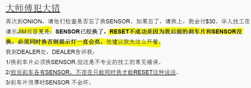 那意思就是后刹车没坏。 警灯是假警告, 不用管, 反正有问题的前刹和sensor已经修好了, 不用担心了。