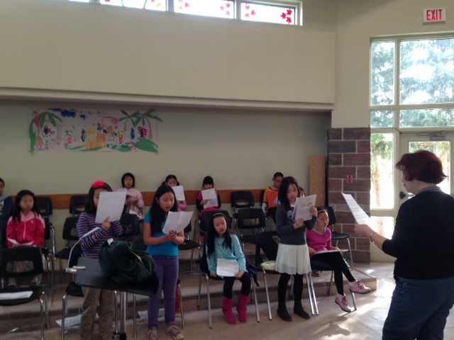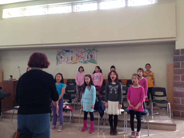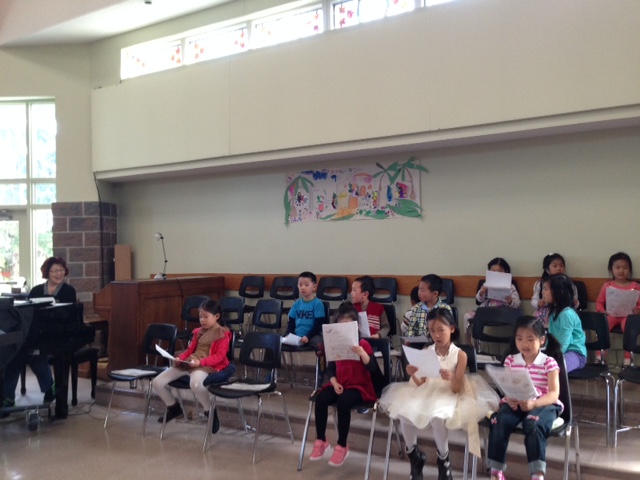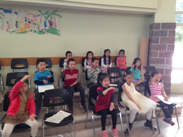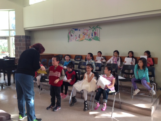 接 着是大班的同学上来就吊起了嗓子, 张老师在旁提示要呼气,要吸气,有的放矢的练声才能唱的美唱的亮。 大班同学的简谱也需要老师口传心授, 五线谱又进一步练习。我们爱乐儿童合唱团的孩子们在张老师这里不仅学习了唱歌更是把乐理知识又巩固了一遍真是一举两得。 孩子们更是个个勇敢的上台才艺表演,有弹钢琴的有讲笑话的,把我们大人都逗乐了!
