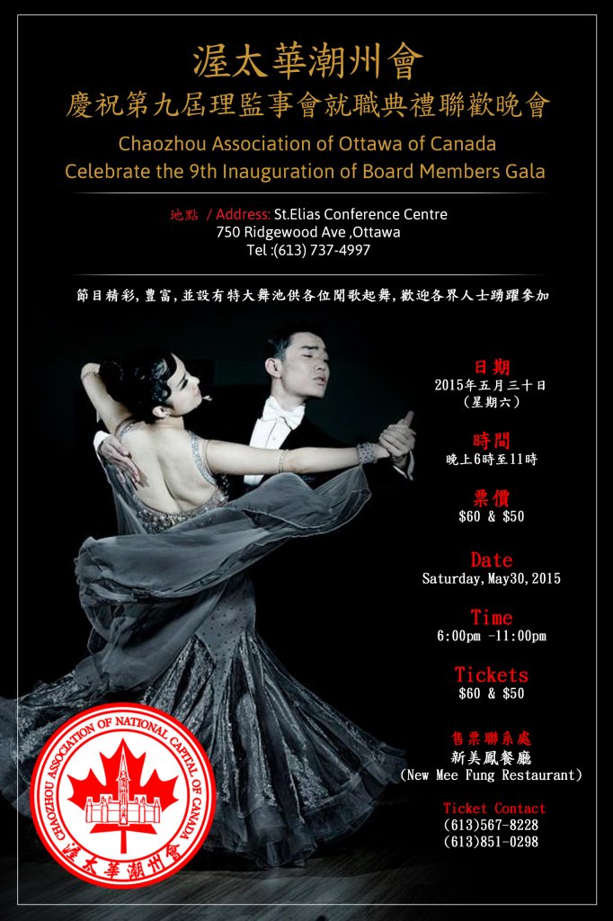 渥太華潮州會定於 2015年 5月 30日(星期六) 晚上六時正舉行慶祝第九屆理監事