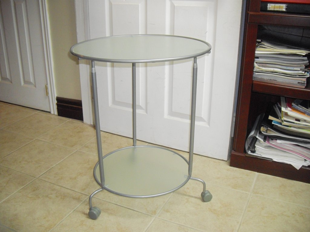 A round glass nightstand with wheels in mint condition, metal frame, 24" high, top diameter: 20" and bottom diameter: 16". $10. Contact by email at jshenottawa@gmail.com or call/text 613-867-6001.