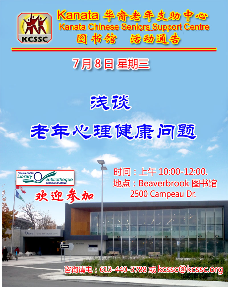 人生不如意十之八九,凡事何必太在意?!家家有本难念的经,只要有家就有一本要唸的经。情绪不调和,如果没有正确的认识和及时的疏导,久了就会出现身体的疾病,如躁郁症和忧郁症。怎么办?!!!七月八日,Kanata华裔老年支助中心图书馆活动将和您聊聊心理卫生健康的话题。
