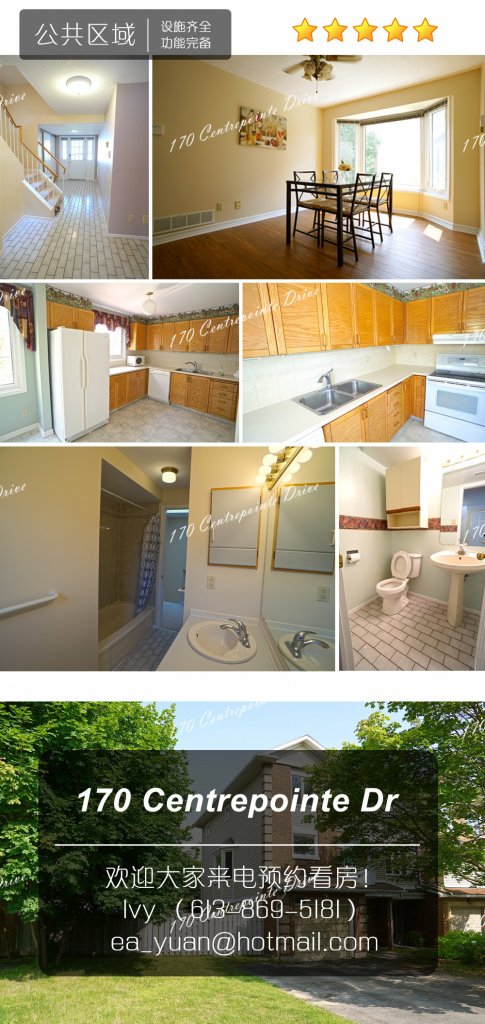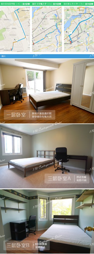 地址:170 Centrepointe Dr,步行10分钟到Algonquin College,且门口有多路公交车,方便出行。