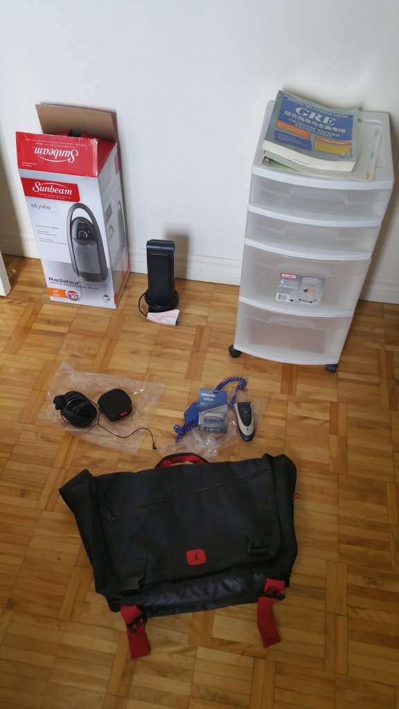 Heater 15 CAD, 台灯 10 CAD,塑料抽屉柜子 10 CAD,两副耳机 10CAD, 剃须刀(带新滤网) 10 CAD, 书包 5 CAD