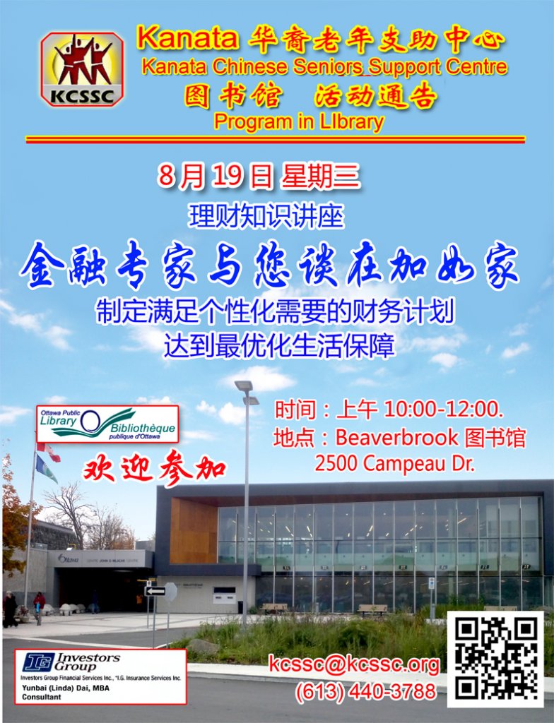 八月十九日,周三上午10-12点。理财专家Linda Dai 将和大家谈谈如何“在加如家”制定满足个性化需要的财务计划,达到最优化生活保障!欢迎大家踊跃参加! (详情:613-440-3788) www.kcssc.org