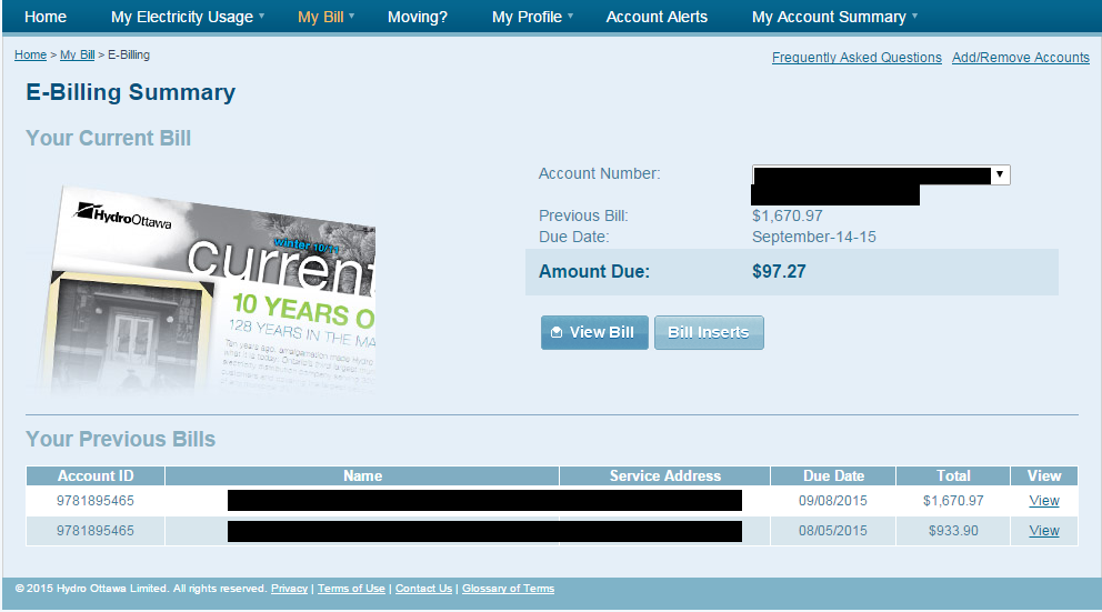 刚刚收到hydro Ottawa的邮件,提醒我账单已经出了,赶紧登陆上去看看,果然新的账单一切正常,只收了520度电的费用,算是松了一口大气。