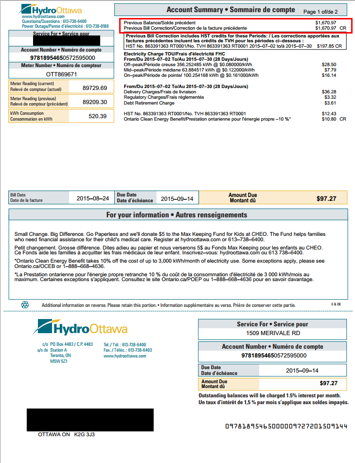 应该是账单错了,虽然接电话的客服人员没有承认,但是昨天帮我开户的hydro Ottawa工作人员是这样回复邮件的: