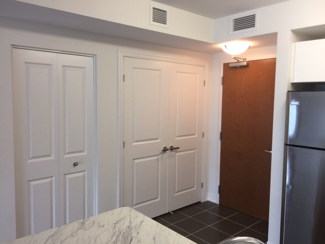 A luxury 1 bedroom/1 den/1 bath condo on the 12th level of a new high rise building. 660 square feet, open concept design with 8.5 feet ceilings, hardwood/ceramic/great carpet floor, beautiful windows, and two patio doors connected to a balcony. Secure entrance, one small office den, and underground parking. New A/C, stainless stove-oven, stainless fridge and dishwasher, washer, and dryer.