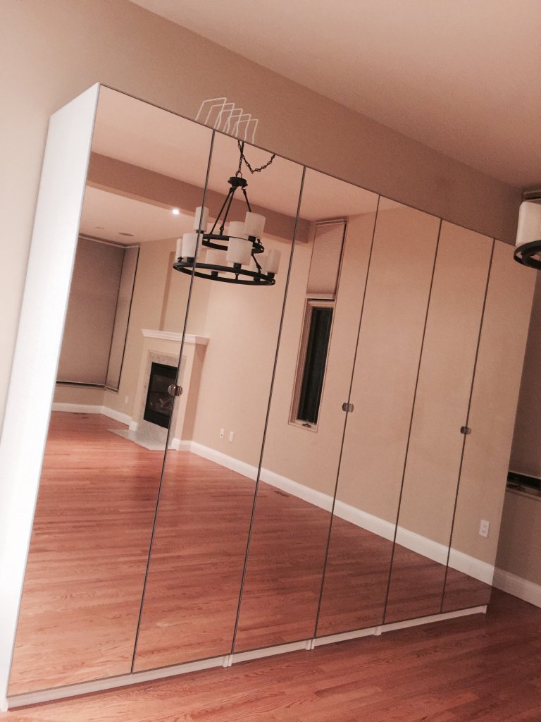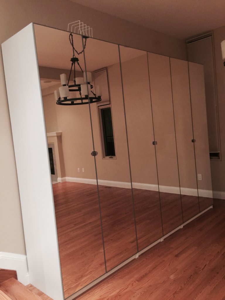 Ikea PAX wardrobe system in white color with mirror doors. Total in 4 pieces. 2 units measured 100x60x236cm,another 2 units measured 50x60x236cm. With shelves inside. Total $300. Need to be picked up before August 31.