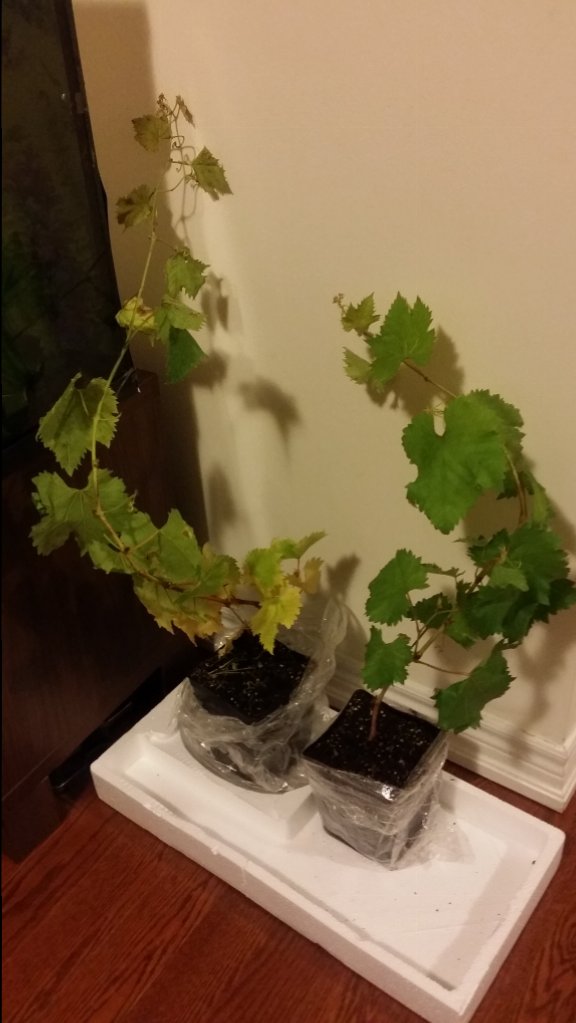 我新收到的两棵巨峰葡萄苗越長越黄了,不知是否因爲季節轉換?