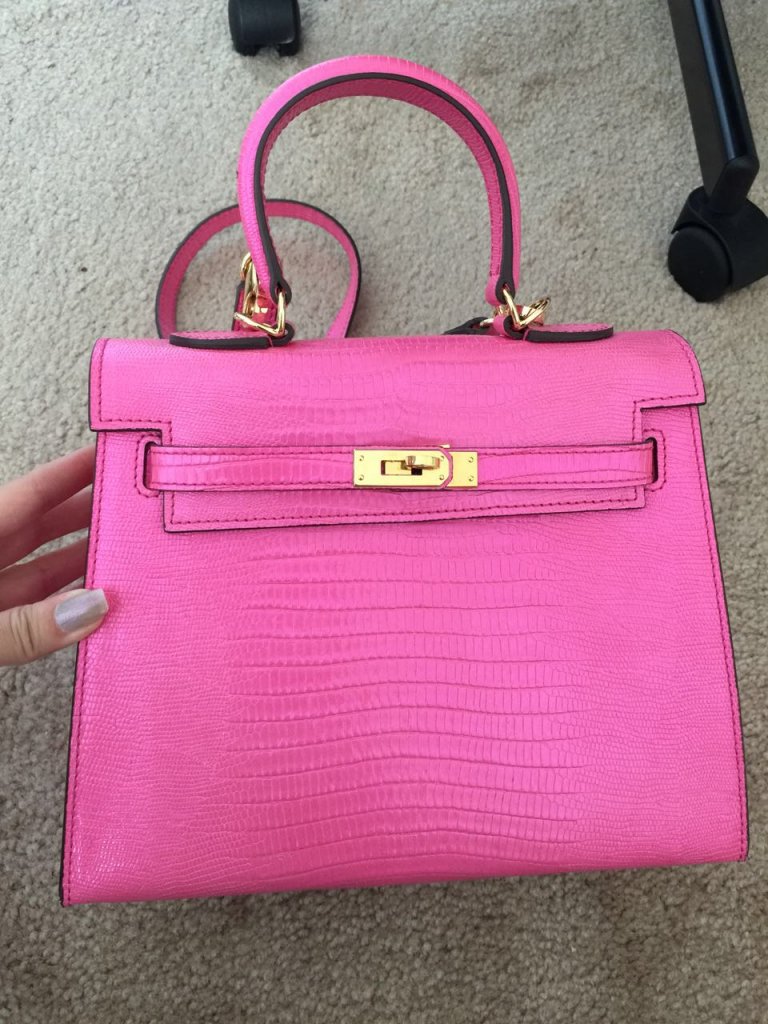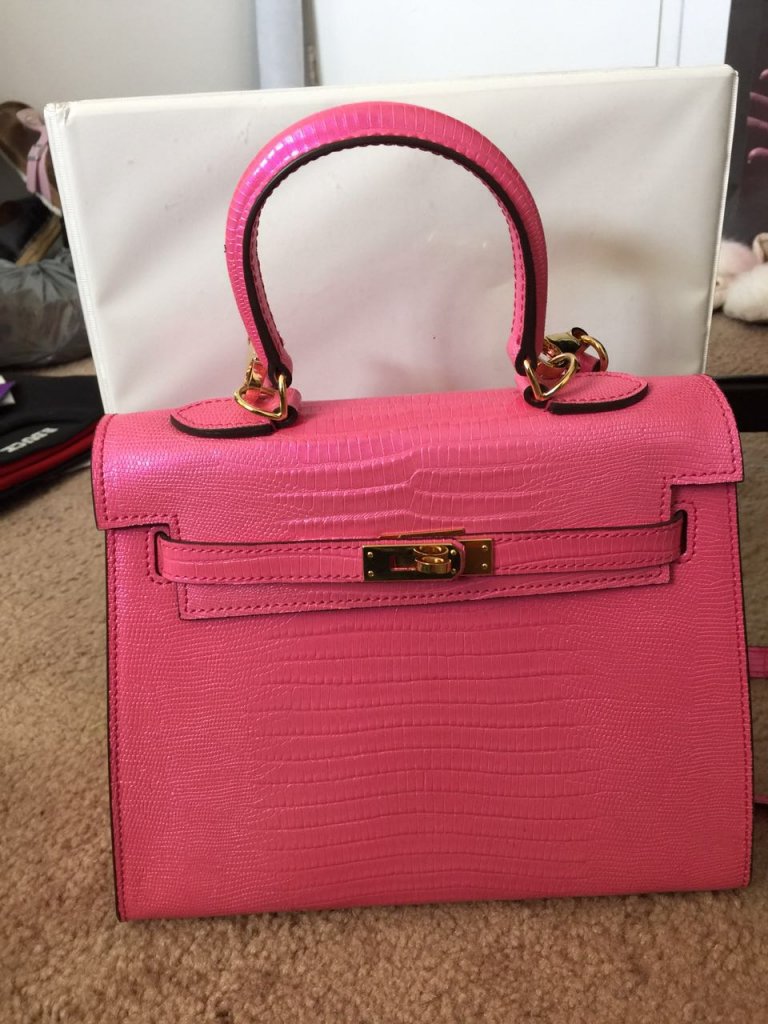 house of hello的包包官网买的 正品有身份卡可以验证 粉色蜥蜴纹 颜色第一张最正,后面两张有点当光了,是小号的有对比图 原价200多 100出 就背出门一次