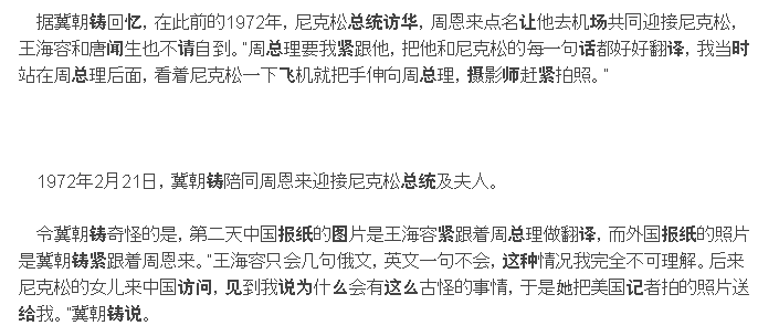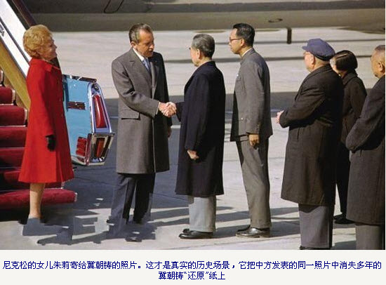 当时两个小姐在外交部横行,冀不得势,外交部下令给新华社挖掉他。周恩来同尼克松握手的镜头也是两幅照片拼起来的。