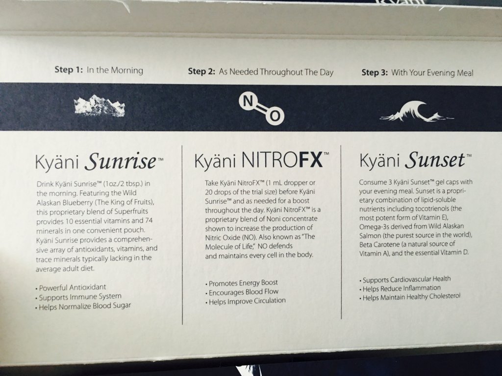 Kyani独特的产品采用最前沿的医学科技,将纯天然的原料正确地配方,为身体带来全面、天然的营养。Kyani产品有三种:新乐思(Kyani sunrise)、新舒康(Kyani sunset)、 尼多乐(Kyani Nitro FX),称作“健康三角组合”。这三种产品为您和家人提供阿拉斯加野生蓝莓、阿拉斯加野生三文鱼、太平洋大溪地的野生诺丽等十几种顶级食物的营养。我们的身体一直进行着自我修复,维持平衡,抵御疾病,我们感受到的各种症状正是身体与我们的沟通方式,让我们知道身体缺了些什么,或者是多了些什么。Kyani健康三角组合便是用大自然中具有生命的草本精华组合,补充生 命、净化生命,让生命充满生机,让身体的抵抗力、免疫力、自愈力和本能发挥到最佳状态,对于健康人群保持健康非常有益,对于亚健康人群恢复健康必不可少, 对于病人在依靠医疗手段的同时加上健康三角组合的食物疗法能够给予病情最大程度的改善。Kyani的三款产品均获得正红印标识,全球免检;另外,Kyani三角组合产品适用于各种人群, 无副作用。