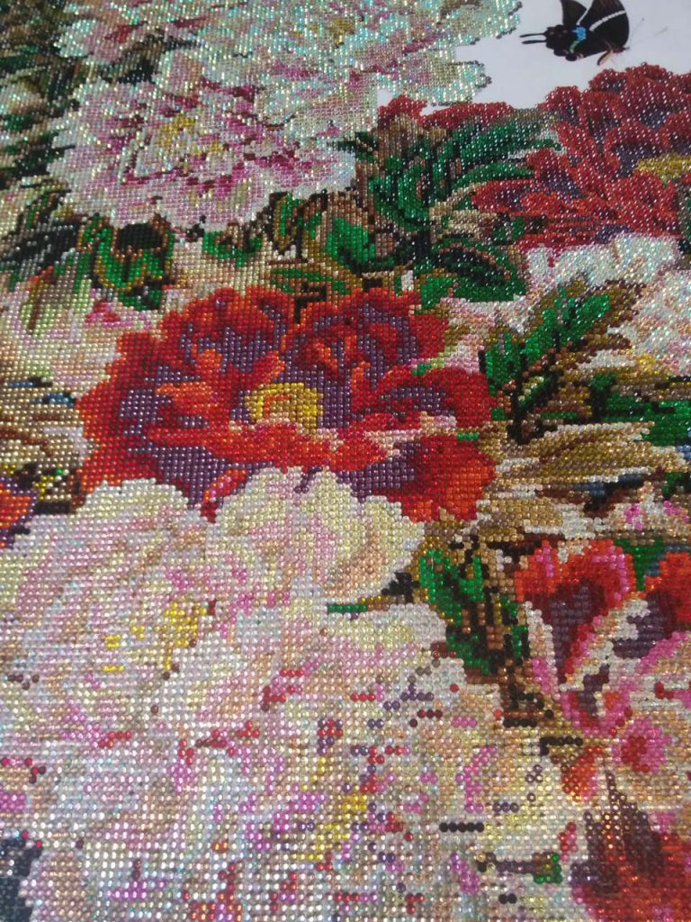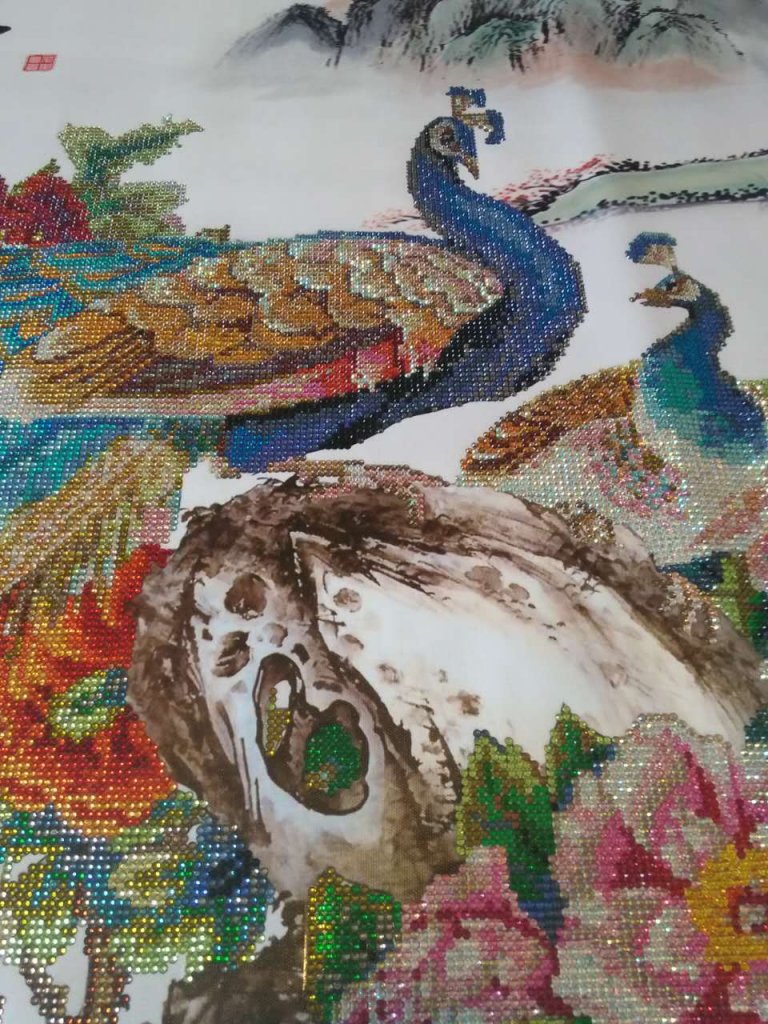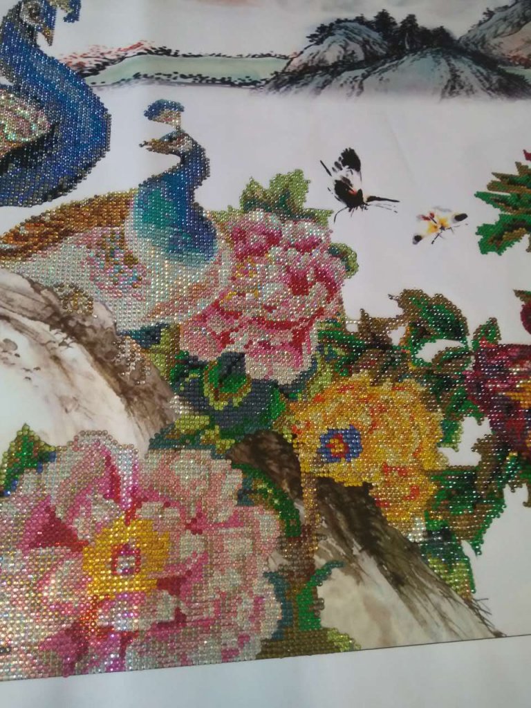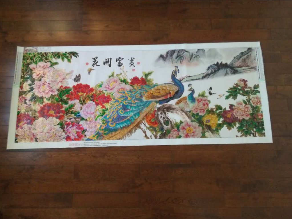 孔雀和牡丹部分是水晶钻,背景部分无钻。颜色十分艳丽,非常漂亮。
