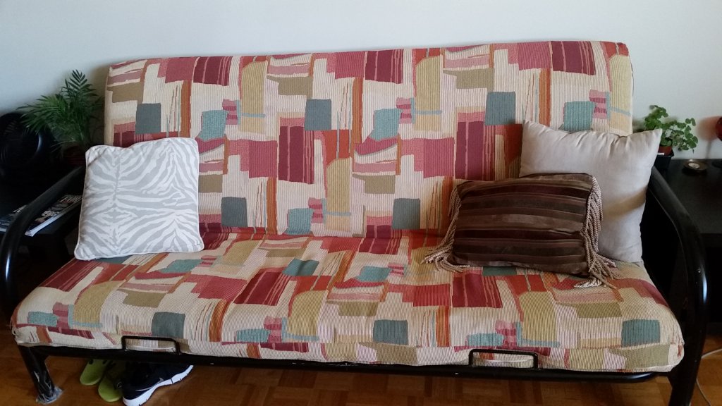 三人沙发床,坐着非常舒服;打开后为double size 的双人床,结实,垫子睡感舒适,黑五特价沙发架子还要90刀,现在一套50刀