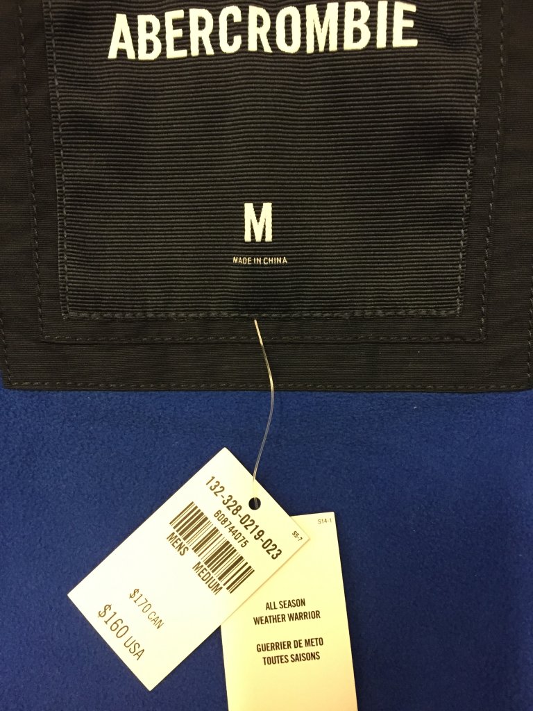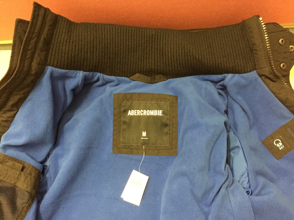 其实还挺喜欢这款蓝色里衬和标志的外套,无奈太大,想转手了再去买件S号的,今年AF网上卖的同款是http://www.abercrombie.ca/shop/ca/mens-outerwear/placeholder-5005589_01,
