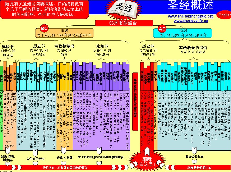 圣经分为两大部。上一部叫“旧约”,包括39卷,是基督降世之前写成的,大多用希伯来文。下一部叫“新约”,包括27卷,是基督升天以後写成的,用的是希腊文。现在世界各国文字的版本,都是从原文圣经翻译而来的。圣经或称“新旧约全书”,共66卷,从天地万物的创造开始,到世界末日新天新地出现为止,宏伟壮观,世无其匹。圣经从开始至末了经过一千五百多年才写成;上一部与下一部之间有四百年的静默期,因为在这期间圣经没有增加。从旧约最後一章到新约开始,虽只有一纸之隔,但西洋历史已由波斯时代进入希腊时代,再由希腊时代进入罗马帝国时代了。