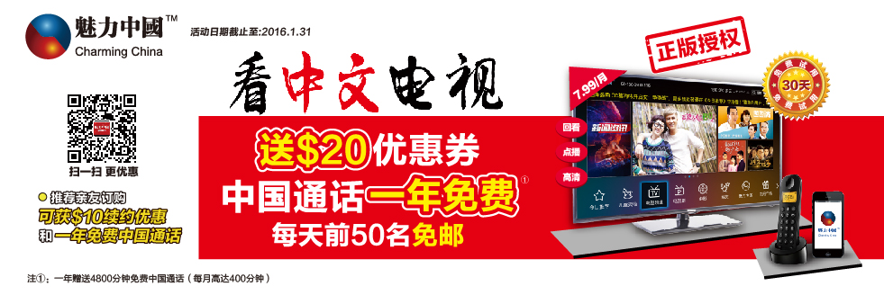 金猴报春归,2016年是中国“十三五规划”的开局之年,我们相信,中国将继续在全球大放光彩,我们将以更快的速度奔向“中国梦”。而梦想开启的这一刻,即将在猴年春晚揭开序幕。在这场全球中华儿女共同狂欢的晚会中,我们共同期许一个崛起的中国的到来,共同祝愿一个更加幸福美好的未来的到来。2016年2月7日晚20:00(北京时间)打开魅力中国中文电视,我们和你一起看春晚,迎接金猴年的到来。现在订购魅力中国中文电视不仅可以减免$20现金,获得一年免费中国通话,而且每天订购前50名用户还可以获得免邮服务。赶紧拨打7*24小时客服热线1-888-800-7808订购,驶向2016年的速度与激情之旅吧。