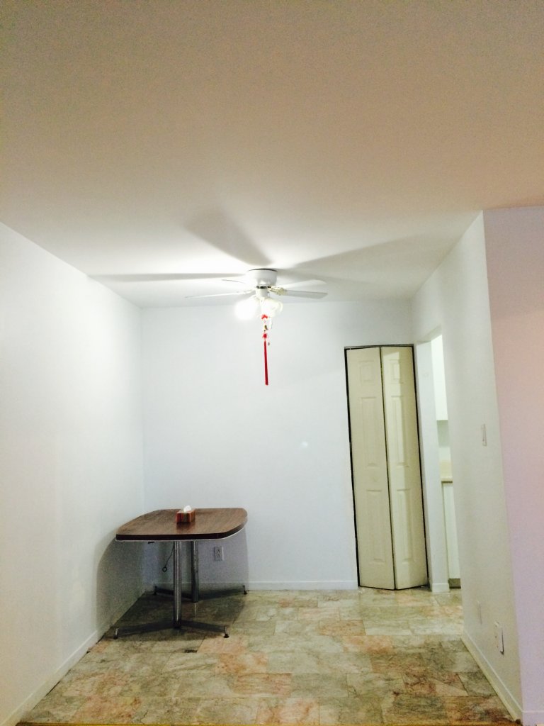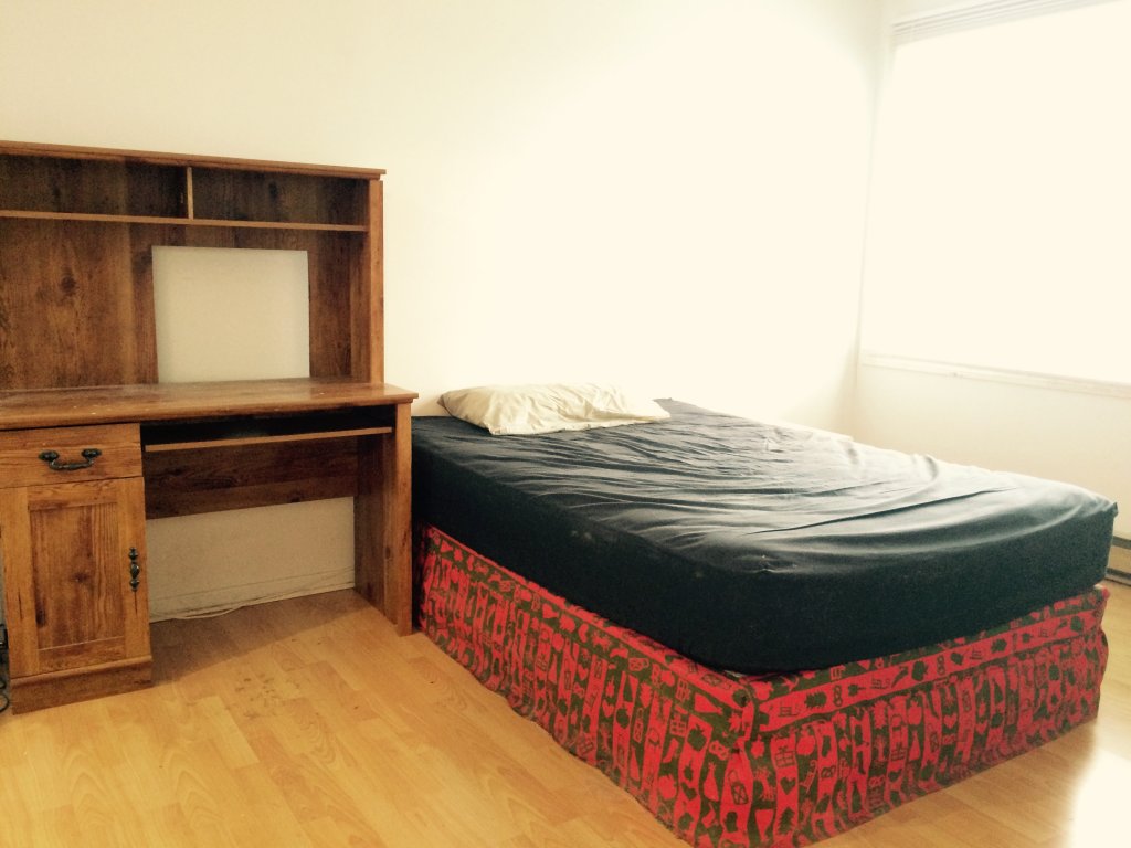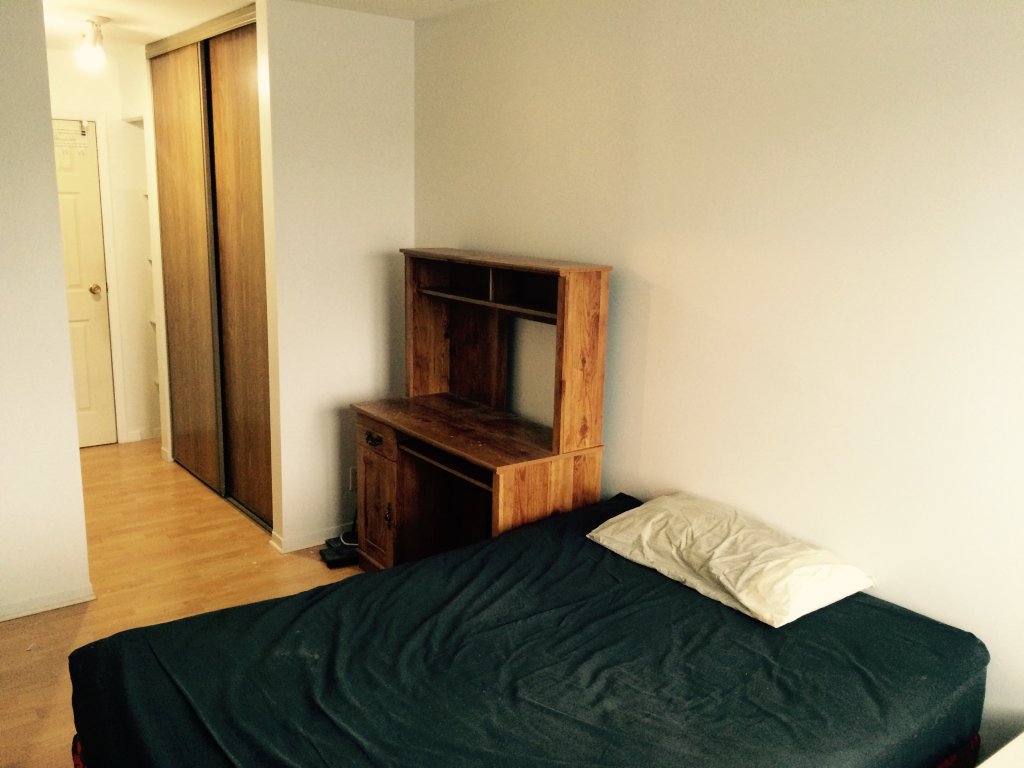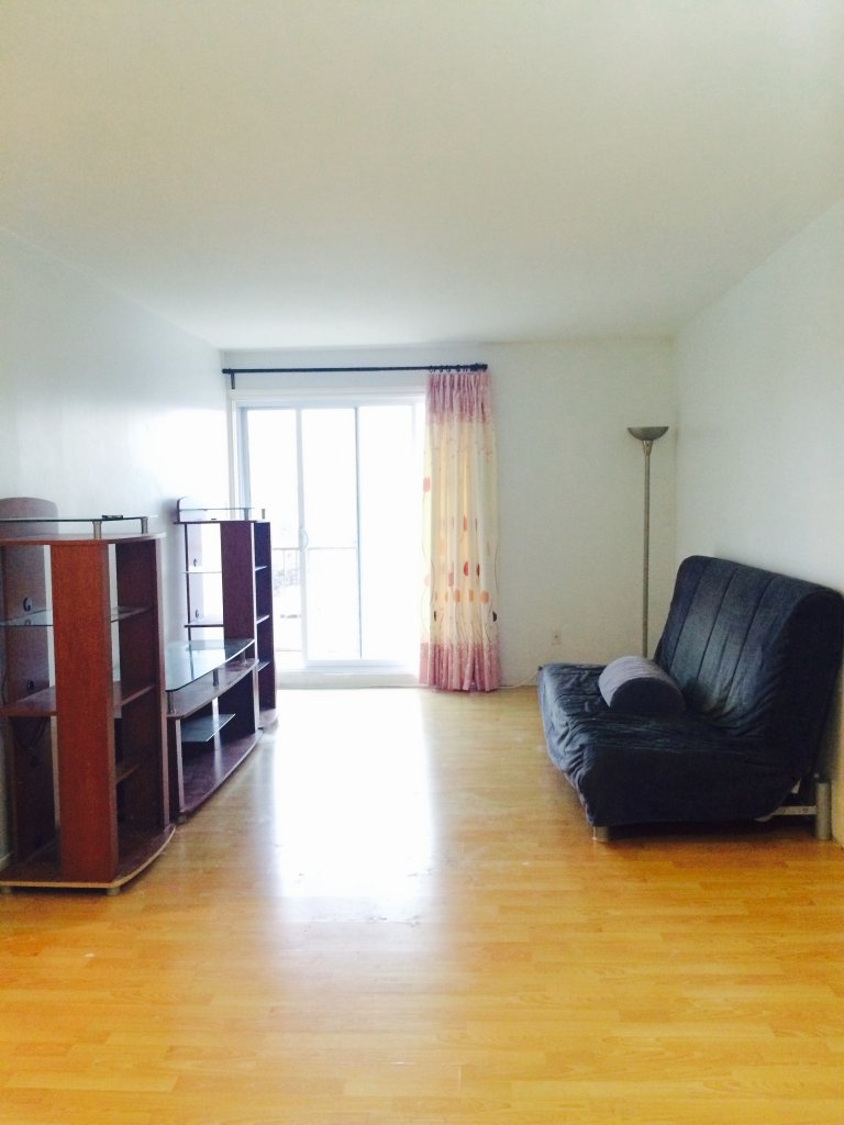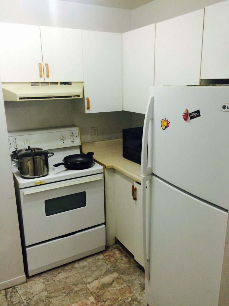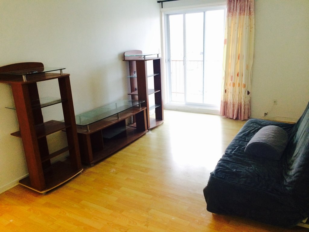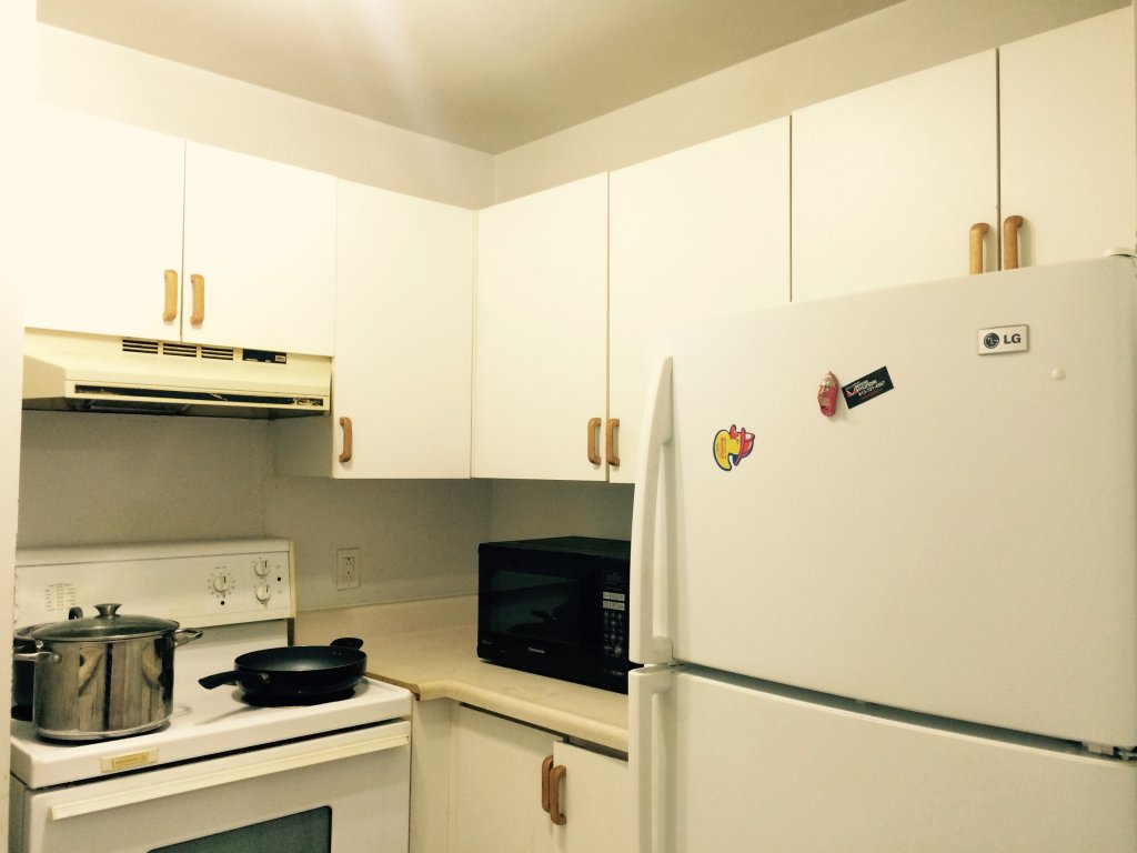Wood floor throughout the apartment. Basic furniture included if needed (master-bedroom bed, office table and chair, sofa, tv stand and shelf, etc). Kitchen appliances also included (stove oven, fridge, microwave). Washing machine and dryer located in the washroom. This apartment has all the basics you need to move in!