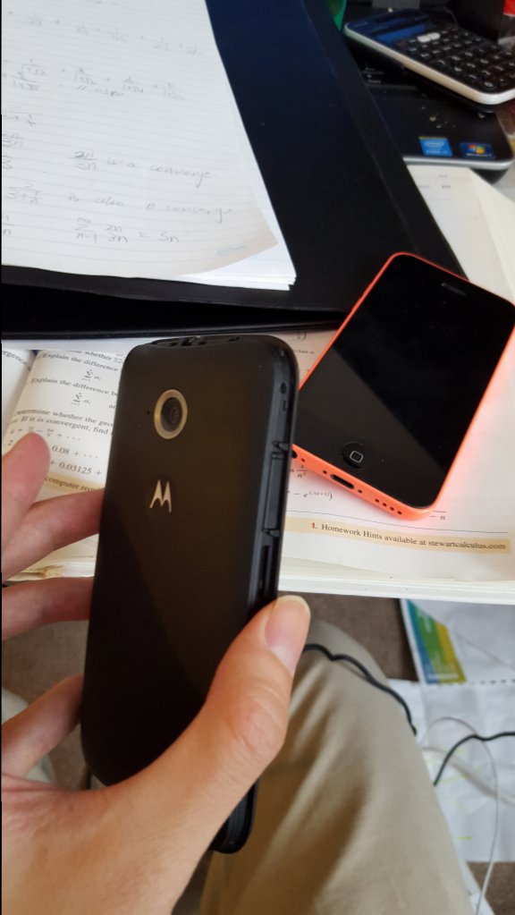 在eBay买的iPhone5 C,除了电源接已坏,要用虚拟键锁屏以外,成色还算不错,没有ID锁,但有运营商锁,有意请联系6136063965. 谢谢。还有一台锁wind的moto e边框没了,其余还行。