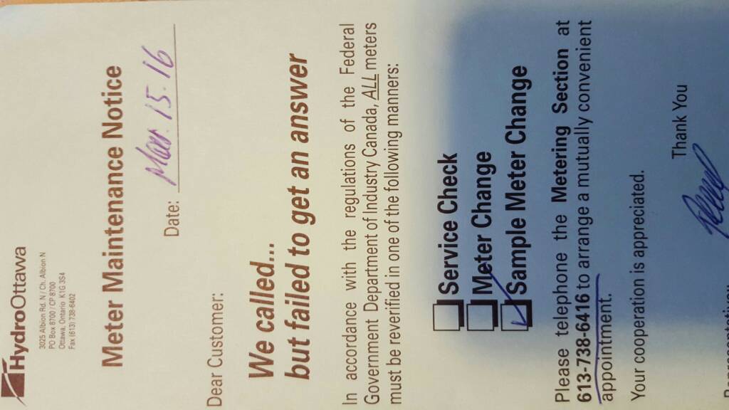 soybean 知名会员 注册 2015-06-22 消息 3,454 荣誉分数 865 声望点数 123 2016-03-15 #6 iamtank 说: 发现门口贴了张单子 号称是 hydro ottawa 要换电表 最近有这种活动么 我明天打电话问一下 点击展开... 突然想起我也收到这封信了,扔的不见了,让打哪个电话来着?