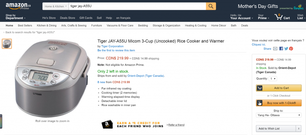 TIGER JAY-A55U 3-CUP 电饭煲(跟一般电饭煲煮出来的饭真的不一样),提升生活品质,从主食开始,用了前后加起来一年,要价60刀。