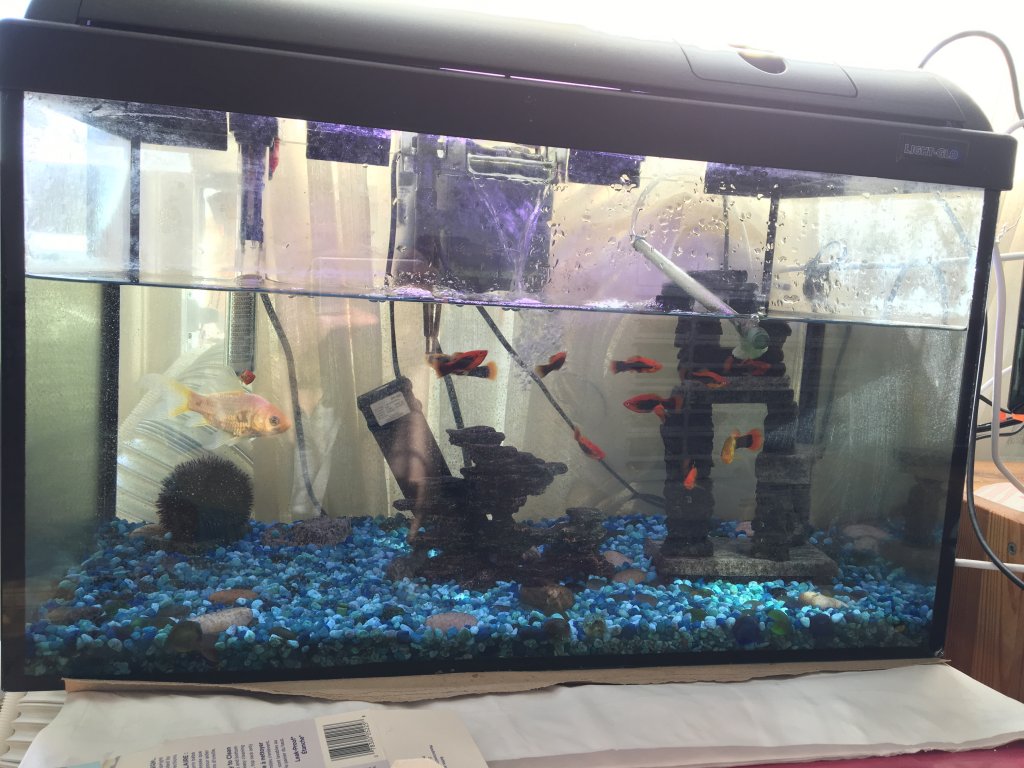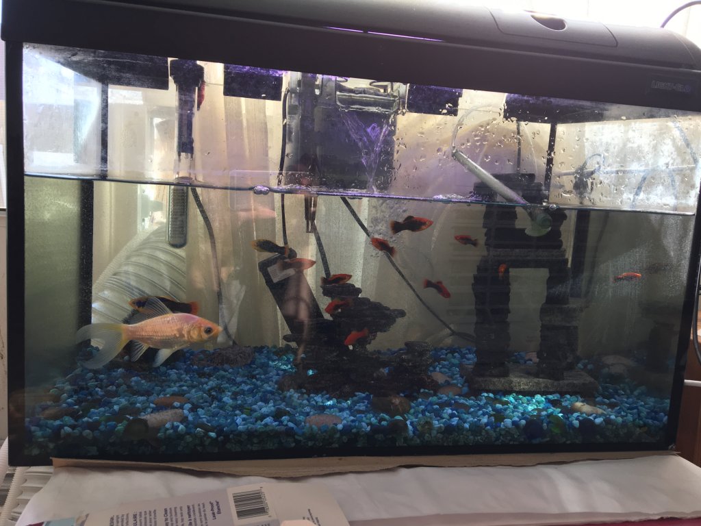 因公寓空间太小又要装空调,现转让15加仑鱼缸,带十多条鱼及全套配件,80刀。