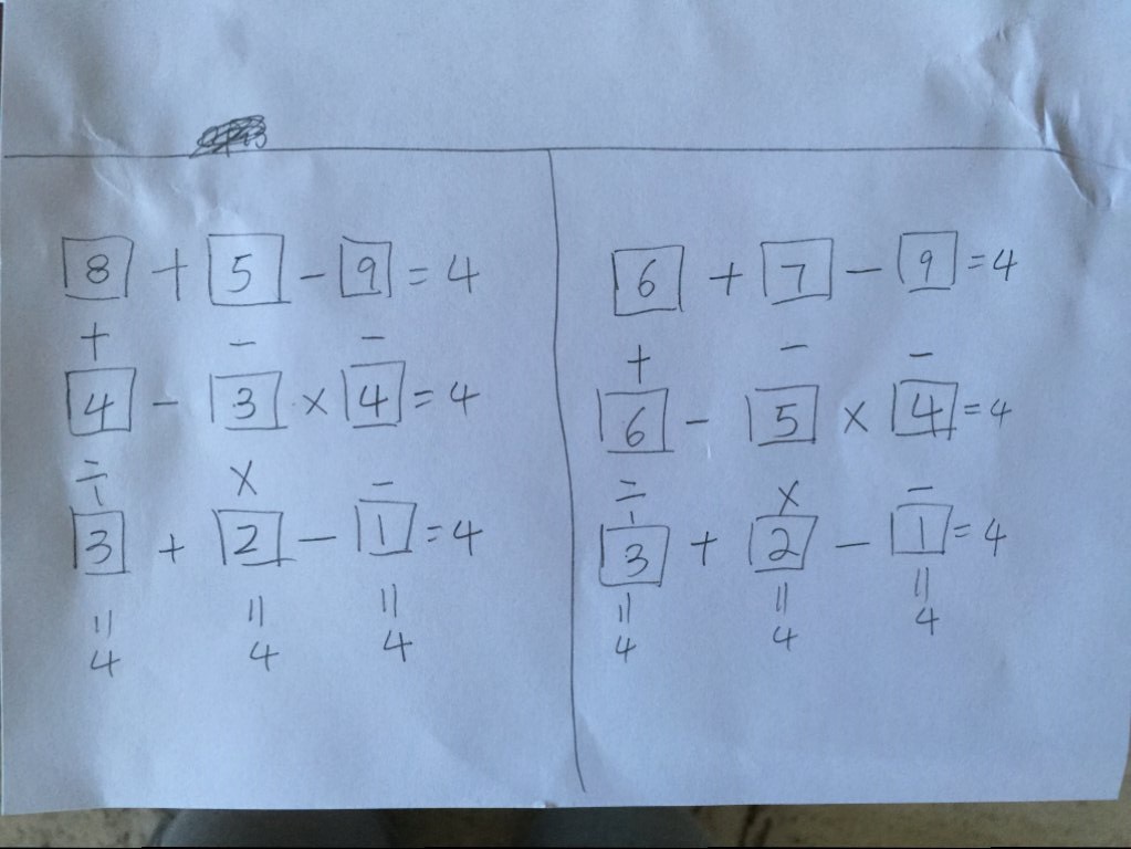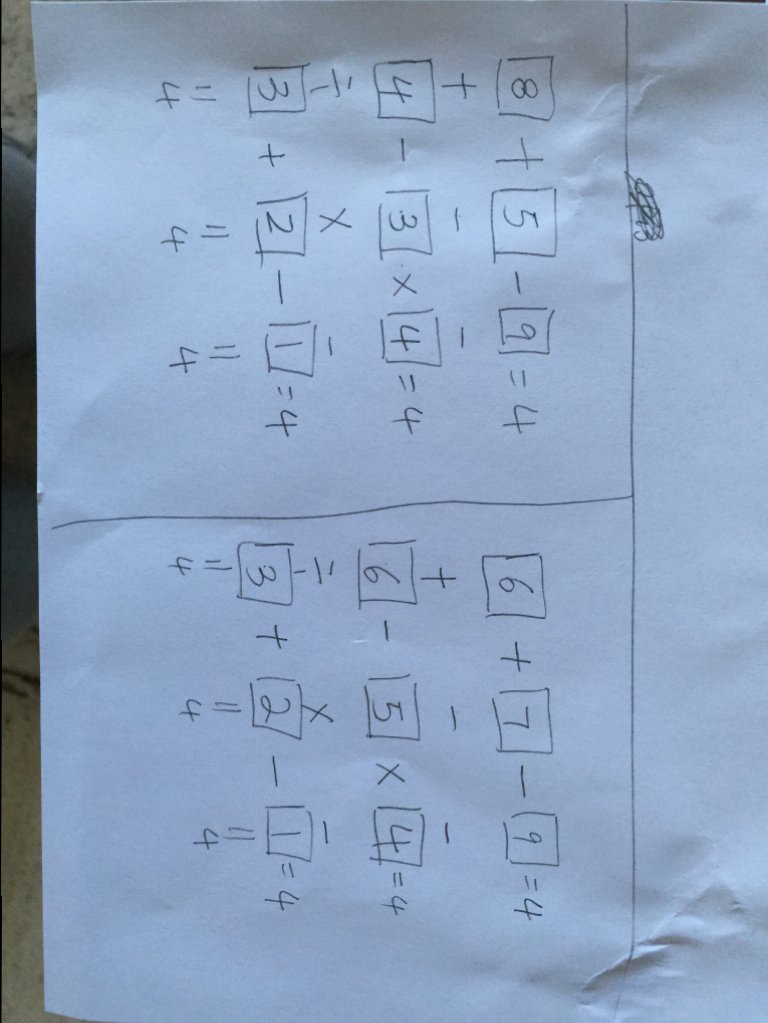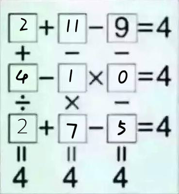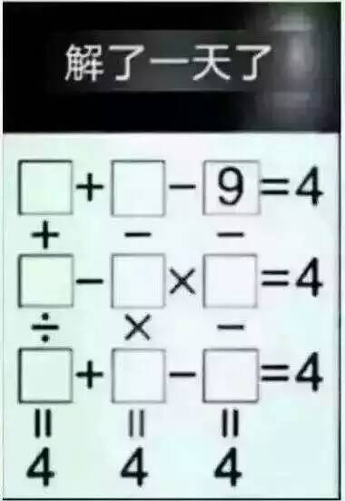 Hainiu 说: 浏览附件605730 点击展开... 我大概蒙了一下。 可怎么用最简单的办法做这个表格? @uglyducking 0 +13 - 9 = 4 +,- ,- 12 -11 x 4 = 4 / , x , - 3 + 2 - 1 = 4 II,,II ,II 4,, 4 ,4 ,