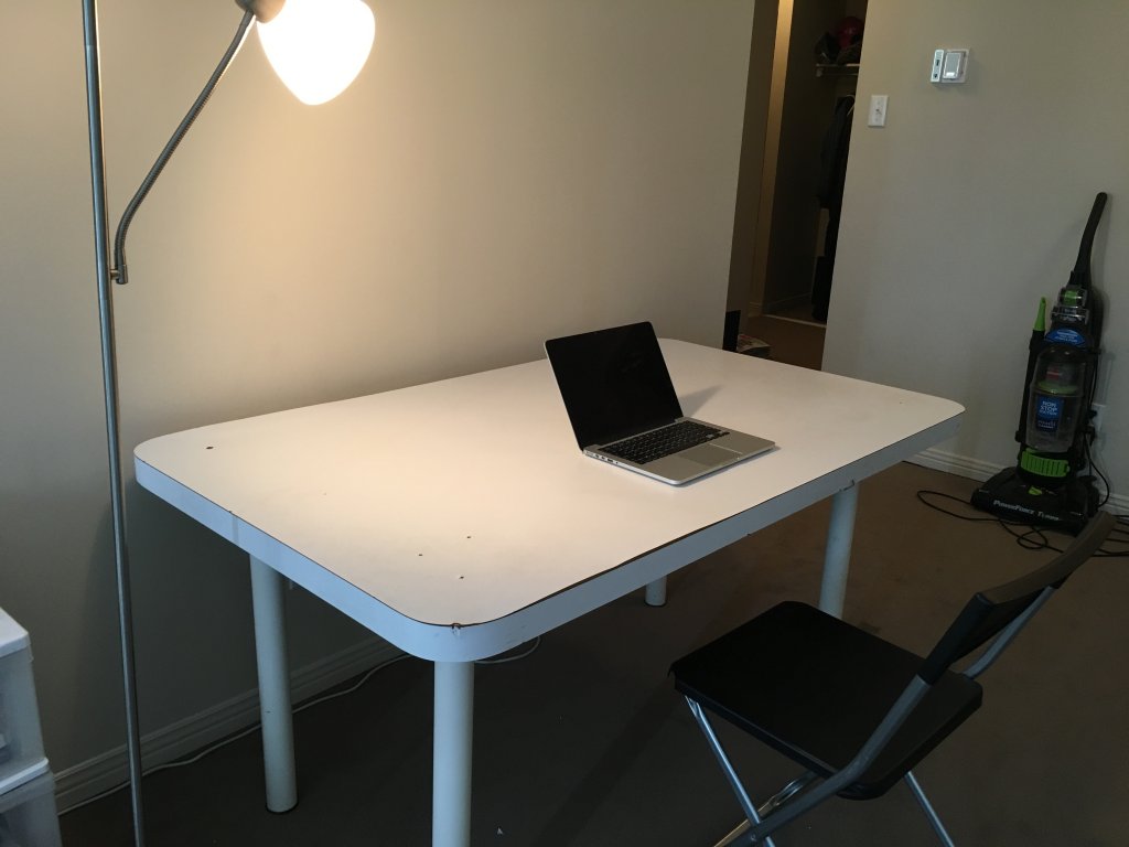 - 白色大桌子,非常大!表面桌上放电脑、音箱、双显示器、很多书还有各种东西都毫无压力!朋友聚会时还可以当餐桌,能坐8~10个人!表面材料易清洁,有点污渍沾点水轻松搞定;<$25>