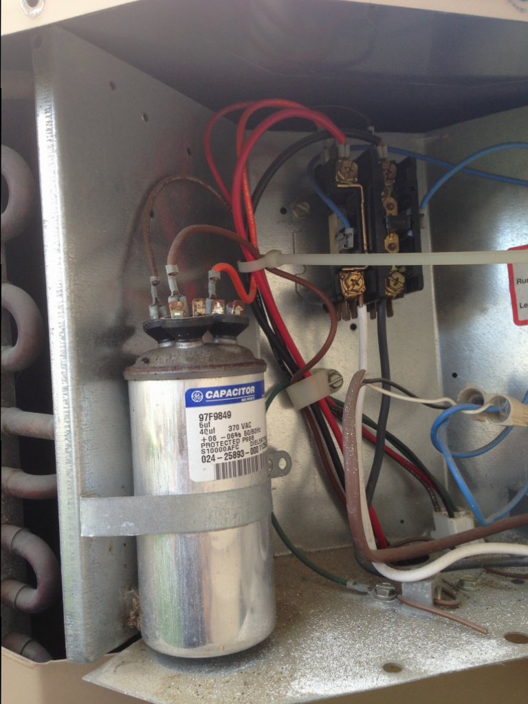 开车到Convex Energy 那里,买了一个电容回来。按照视频,到室外拔电源开关,卸螺丝,把旧电容拆下来,很小心的查看了哪根线连哪个插头,照了一张照片。然后换上新电容,核对了一遍电线接得没问题,拧上螺丝,插上电源开关,折腾了一遍,热出一头汗来。